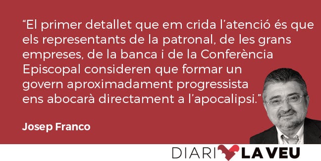 El primer detallet que em crida l’atenció és que els representants de la patronal, de les grans empreses, de la banca i de la Conferència Episcopal consideren que formar un govern aproximadament progressista amb la col·laboració de Bildu, ERC, Compromís, el BNG i alguns altres, a més del PSOE i de Podemos, ens abocarà directament a l’apocalipsi i morirem tots, i totes, de molt mala manera. Això, des del meu punt de vista, equival a afirmar que els vots als partits esmentats no són tan bons com els vots a VOX, el PP i Ciudadanos, és a dir, que els milers i milers de vots que sumen entre tots són vots equivocats, per anticonstitucionalistes.
