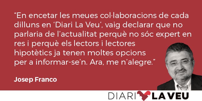 En encetar les meues col·laboracions de cada dilluns en Diari La Veu, vaig declarar que no parlaria de l’actualitat perquè no sóc expert en res i perquè els lectors i lectores hipotètics ja tenen moltes opcions per a informar-se’n. Ara m’alegre d’haver pres una decisió que m’excusa de pronunciar-me a propòsit de tants i tants fets desagradables com estan produint-se al nostre territori i que afecten les nostres vides. Però mantindré la meua intenció de no dir res que no siga obvi o que ja haja dit algú amb més autoritat i més coneixement de causa que jo.