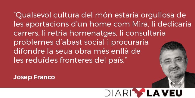Qualsevol cultura del món estaria orgullosa de les aportacions d’un home com Mira, li dedicaria carrers, li retria homenatges, li consultaria problemes d’abast social i procuraria difondre la seua obra més enllà de les reduïdes fronteres del país. Nosaltres, els valencians, ens conformem a admirar-lo, llegir amb enveja, admiració i una miqueta de comprensió les seues obres i desitjar-li, com faig jo ara, una vida llarga i tan fructífera com fins ara. Per molts anys, Quico!