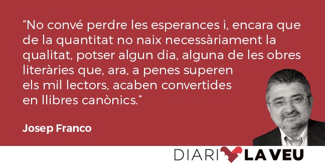 No convé, per tant, perdre les esperances i, encara que de la quantitat no naix necessàriament la qualitat, potser algun dia, alguna de les obres literàries que, ara, a penes superen els mil lectors, acaben convertides en llibres canònics, de la mateixa forma com les expectatives pessimistes de Fuster, amb el pas del temps, el treball ben fet, l’honradesa i la insistència, han esdevingut una esperança esponerosa per al País Valencià i les persones que l’habitem.