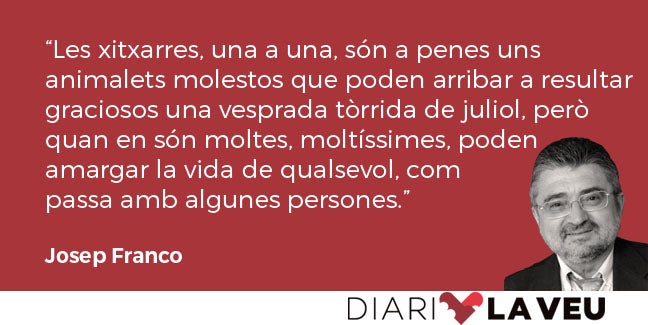 En aquesta època de l’any, quan ens castiguen les ponentades –de ponent, ni vent ni gent, ni terra ni casament– que ara en diuen “ones de calor”, les cigales o xitxarres mascles, que han passat l’any amagades i en silenci, ens alegren les vesprades amb el seu cant agut, incisiu, persistent, perquè volen aprofitar les poques hores de vida que els ha donat la natura per a reproduir-se, mentre les formigues treballen sense descans, com en la faula. Les xitxarres, una a una, són a penes uns animalets molestos que poden arribar, fins i tot, a resultar graciosos una vesprada tòrrida de juliol, però quan en són moltes, moltíssimes, poden amargar la vida de qualsevol, com passa amb algunes persones que, individualment, poden resultar entranyables o divertides per les seues opinions o actituds però quan es reuneixen en bandades fan una miqueta de por.