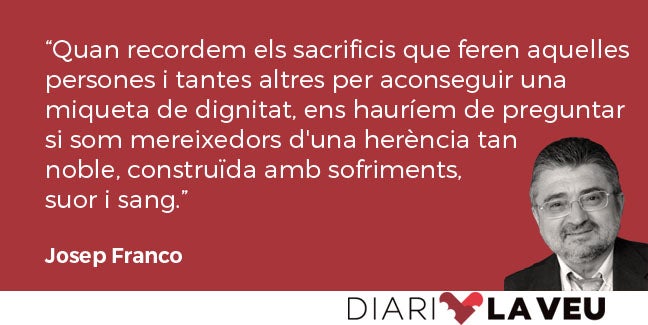 Quan recordem els sacrificis que feren aquelles persones i tantes altres per aconseguir una miqueta de dignitat, ens hauríem de preguntar si som mereixedors d’una herència tan noble, construïda amb sofriments, suor i sang, per milers de persones que volgueren contribuir a l’evolució de la nostra espècie. Una espècie que, ara, amb l’actitud d’alguns ‘dirigents’ i la submissió de les majories, sembla entossudida a tornar a les cavernes.