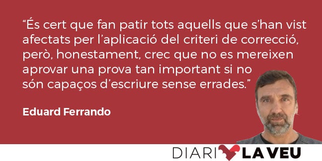 És cert que fan patir tots aquells que s’han vist afectats per l’aplicació del criteri de correcció, però, honestament, crec que no es mereixen aprovar una prova tan important si no són capaços d’escriure sense errades. Tothom sap que a les oposicions de què parlem s’han presentat examinands que provenen d’altres graus i llicenciatures que no tenen tanta fermesa en la correcció ortogràfica, però això no ha de servir d’excusa.