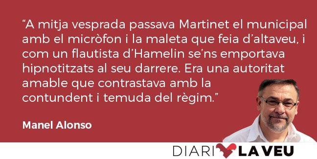A mitja vesprada passava Martinet el municipal amb el micròfon i la maleta que feia d’altaveu, i com un flautista d’Hamelin se’ns emportava hipnotitzats al seu darrere. Amb la boca menuda es queixava i ens enviava una i altra vegada a casa. No li féiem cas. La seua era una autoritat amable que contrastava amb la contundent i temuda del règim.