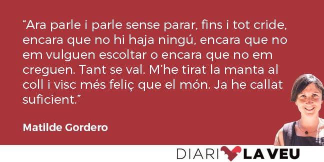 La Marga arribà a Cullera i començàrem a parlar com si fera anys, segles que no haguérem obert la boca. Continuàrem parlant tot el temps que es quedà a ma casa, com si no ho haguérem fet mai. Parlàvem encara quan ens acomiadàrem i cadascuna va seguir parlant, pel seu compte, una vegada ens separàrem. Parlem per telèfon sovint i ens expliquem que des de la seua visita cap de les dues no ha pogut parar de parlar, encara que no tinguem amb qui. Un dia em digué: «Sobretot parle amb mi mateixa». A mi també em passa això. El cas és que més aviat m’escolte com mai no ho havia fet. És més: he descobert com sona la meua veu. Ara parle i parle sense parar, fins i tot cride, encara que no hi haja ningú, encara que no em vulguen escoltar o encara que no em creguen. Tant se val. M’he tirat la manta al coll i visc més feliç que el món. Ja he callat suficient.