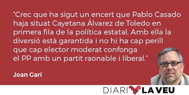 Crec que ha sigut un encert que Pablo Casado haja situat Cayetana Álvarez de Toledo en primera fila de la política estatal. Amb ella la diversió està garantida i no hi ha cap perill que cap elector moderat confonga el PP amb un partit raonable i liberal. Les coses clares, certament. Qualsevol dia, això sí, ens desdejunarem amb la notícia que la rossíssima Cayetana ha canviat de partit i s’ha fet de Vox. Molts se sorprendran, en una tal circumstància.