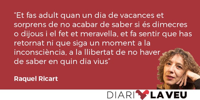 S’acosten a vessar de promeses. Llibres, passejades, llibres, sopars a la fresca, alguna escapada, llibres, un trosset de mar i encara llibres i els amics i els llibres. S’acosten enganyoses, com si fossen eternes. Eren eternes, en la infantesa. Eren cel blau i cinema d’estiu. Eren platja i migdiades obligatòries. Eren poca roba i anar descalços i aigua, sempre aigua, ni que fos d’una mànega. L’estiu s’estenia com una plana immensa sense horitzó en aquells dies en què tant feia si era dimecres o dijous o divendres. Potser fer‑se adult és veure amb claredat els límits d’aquella plana, saber que no és sinó un tros, però mirar‑lo amb tot l’agraïment, aclucant els ulls per amagar‑ne les vores i creure de bell nou, ni que siga un moment, en l’eternitat. Et fas adult quan les migdiades esdevenen un plaer, quan ets tu qui les recomana als menuts. Et fas adult quan un dia de vacances et sorprens de no acabar de saber si és dimecres o dijous o divendres i el fet et meravella, et fa sentir que sí, que has retornat ni que siga un moment a la inconsciència, a la llibertat de no haver de saber en quin dia vius, a la llibertat de no saber què és ser lliure. I, amb tot, ja puc preveure que algun dia d’uns quants anys endavant, si Déu vol, com diria ma mare, potser enyoraré aquesta vida adulta, aquesta vida d’enmig en què esdevens responsable de menuts i de grans, en què fas vacances però de tant en tant t’assalten, com un núvol de mosquitets, les ombres dels assumptes que has deixat per resoldre, les coses que t’esperen en les vores del tros, indefugibles. Potser ho enyoraré, tot això, quan ja no seré adulta sinó gran, perquè, llavors, segons m’han explicat, has d’aclucar els ulls per no veure les vores, no ja del tros, sinó de la vida. Llavors potser enyores recordar amb claredat si és dimecres o dijous o divendres i els problemes que ara et furten el son, amb la distància, esdevenen reptes dignes de la vida. Però això serà més endavant, uns quants anys enllà, si Déu vol. Ara és diumenge, s’acaba el mes i s’acosten les vacances a vessar de promeses i de llibres per llegir, d’una escapada, d’amics, del record de La Marabunta en aquell cinema d’estiu vora de casa. És diumenge i ja fa un mes llarg que l’alfàbega em retorna al meu poble cada dia quan la regue, perquè en regar‑la omple la casa de l’aroma de l’estiu, del tros, de la plana infinita de la infantesa. Tot serà cosa de tenir‑ne sempre, d’alfàbega a l’estiu, de sentir que la vida no és sinó un regal magnífic. De recordar‑ho cada matí i cada nit de dimecres, de dijous, de divendres. Malgrat les vores nítides i el despertador i els núvols de mosquits. Bon estiu!