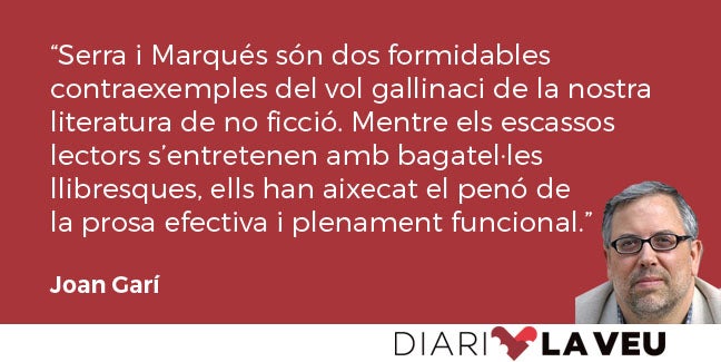 Serra i Marqués són dos formidables contraexemples del vol gallinaci de la nostra literatura de no ficció. Mentre els escassos lectors s’entretenen amb bagatel·les llibresques, ells han aixecat el penó de la prosa efectiva i plenament funcional, la que es projecta en el temps i hi perdura, la que ens homologa amb les grans literatures del món.