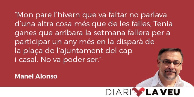 Passaren els mesos i arribaren les falles. Mon pare l’hivern que va faltar no parlava d’una altra cosa més que de les falles. Tenia ganes que arribara la setmana fallera per a participar un any més en la disparà de la plaça de l’ajuntament del cap i casal. No va poder ser.