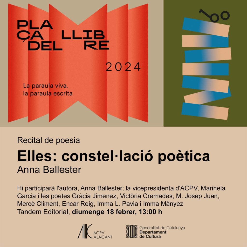 L’entitat, presidida per Anna Oliver, organitzarà el recital de poesia que porta el títol d’«Elles: constel·lació poètica», a càrrec de l’autora Anna Ballester i del qual formaran part la vicepresidenta d’Acció Cultural, Marinela Garcia, amb les poetes Gràcia Jiménez, Victòria Cremades, M. Josep Juan, Mercè Climent, Éncar Reig, Imma L. Pavia i Imma Mànyez. Aquest acte es desenvoluparà diumenge 18 de febrer a les 13.00 a la plaça Sèneca d’Alacant, on se celebrarà la Plaça del Llibre.