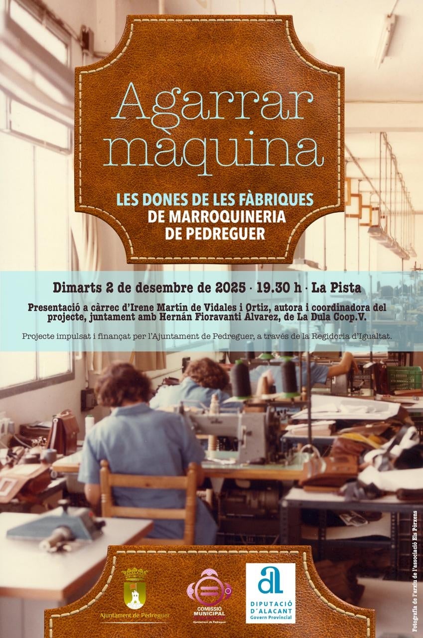 “Agarrar màquina. Les dones de les fàbriques de marroquineria de Pedreguer” ha estat coordinat i dirigit per Irene Martín de Vidales i Ortiz, amb el suport tècnic del despatx de sociologia La Dula, i analitza el pas de l’economia rural a l’economia fabril des d’una perspectiva de gènere i recupera la memòria col·lectiva de les dones que van treballar tant a les fàbriques com als tallers i a les llars.