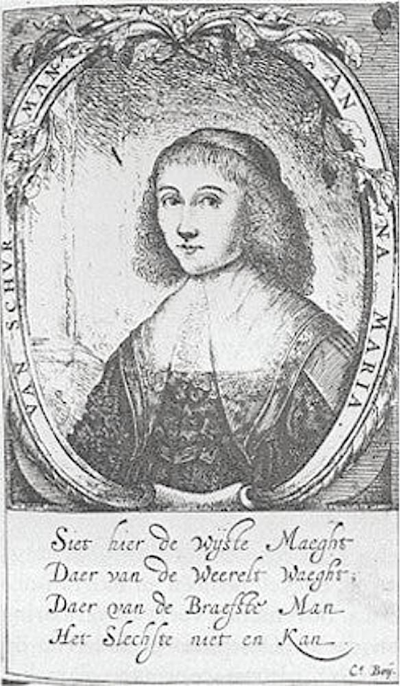 Una dècada després, el 1649, Jan Lievens pintava Van Schurman asseguda davant del seu escriptori amb un llibre entre les mans. Sobre un fons monocrom, nu, el retrat, de tres quarts, ocupa l’eix central. La quantitat d’objectes –sols un tinter i una ploma- i les referències espacials s’han reduït fins al mínim indispensable; no en calen més. En el conjunt, dominat amb contundència pels fulls i el rostre, lluminosos, només l’abric de pell fosc i la diadema amb què se cenyeix els cabells denoten l’estament al qual pertany aquesta dona que, en una pausa de la lectura, ha alçat el cap i ens mira amb l’afabilitat i la seguretat de qui sap que els seus coneixements igualen els de qualsevol home savi.