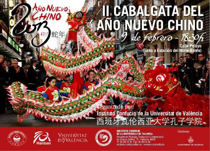 Els actes de l’Any Nou pretenen acostar les tradicions culturals i festes de la cultura xinesa. La Cavalcada Xinesa començarà a les 18.30 hores del dissabte 9 de febrer, des del carrer Pelayo de València, al costat de l’Estació del Nord. Ja a la nit, es realitzarà el tradicional sopar d’Any Nou.