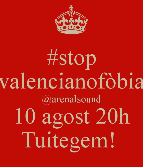 Dissabte 10 d’agost a les 20.00 hores esteu convocats tots al twitter amb el hastag #stopvalencianofòbia @arenalsound per denunciar les agressions reiterades que pateixen els valencianoparlants al País Valencià, la darrera a l’Arenal Sound on un xic, el Christian va patir agressions físiques per parlar valencià i a la Laura, una xica de Castelló, un agent del control de seguretat li va etzibar que si no li parlava en espanyol no entrava al recinte.