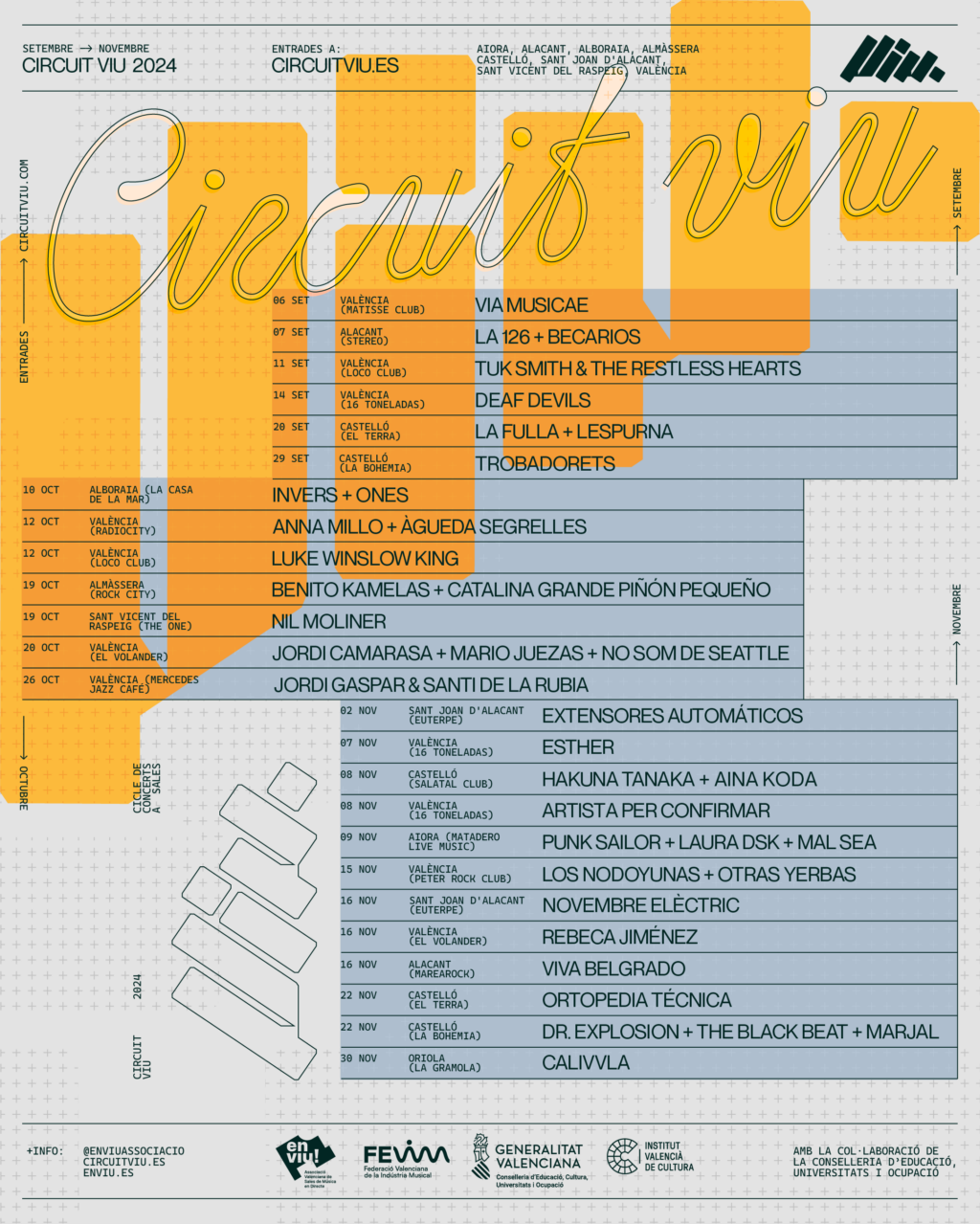El divendres 6 de setembre començarà la cinquena edició del Circuit Viu, que s’allargarà fins al 30 de novembre amb un total de 38 grups musicals que actuaran en 18 sales del País Valencià per a donar a conèixer les seues propostes musicals que van del pop al folk passant per la cançó d’autor, pel jazz i per combinacions d’estils de grups valencians i d’arreu de l’Estat.