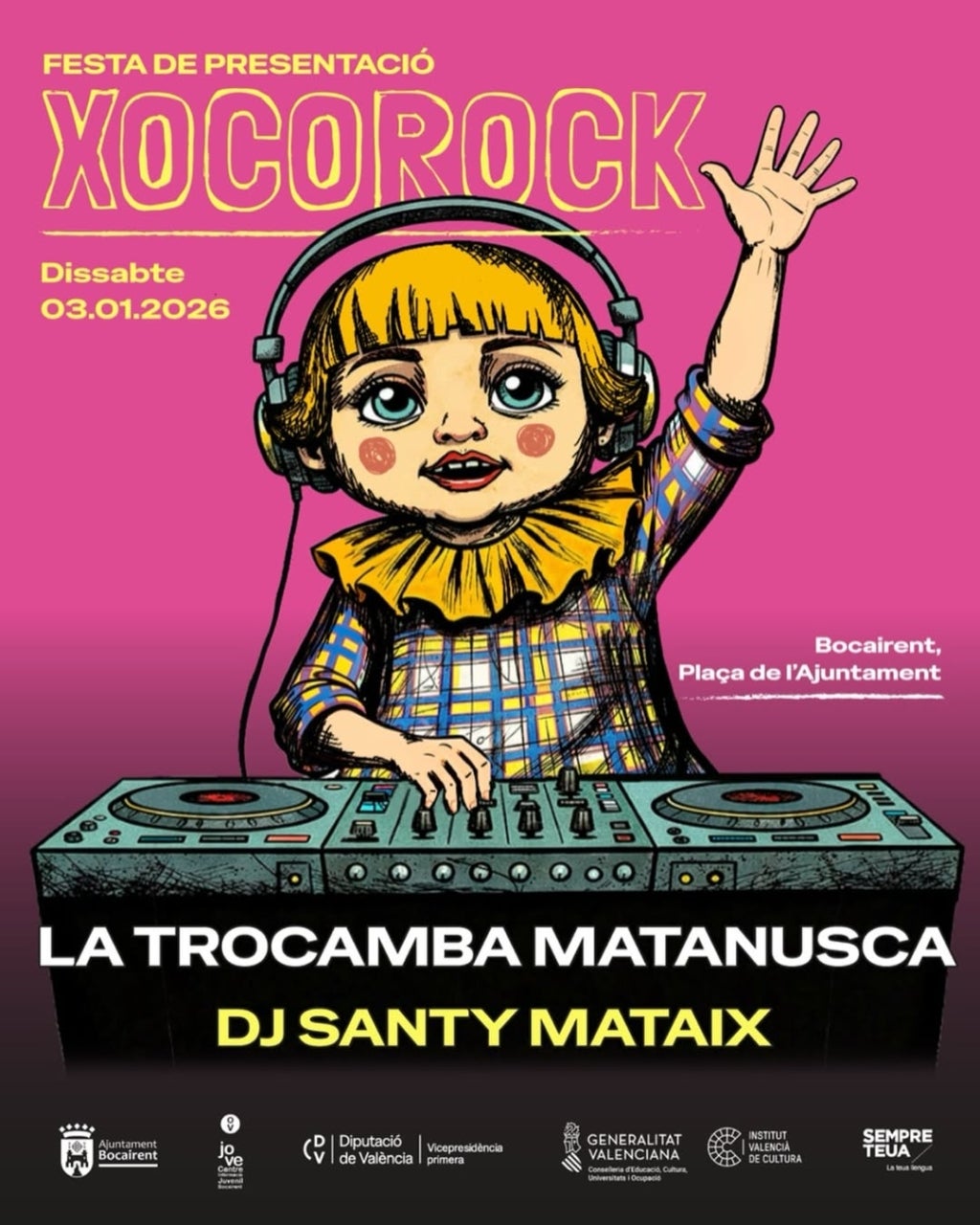 Bocairent (la Vall d’Albaida) acollirà dissabte 3 de gener del 2026 la festa de presentació del Xocorock, un nou projecte musical que naix amb voluntat festiva, popular i arrelada al territori. L’acte tindrà lloc a la plaça de l’Ajuntament i gaudirà les actuacions de La Trocamba Matanusca i DJ Santy Mataix, dos referents de la música festiva i de base tradicional al País Valencià.