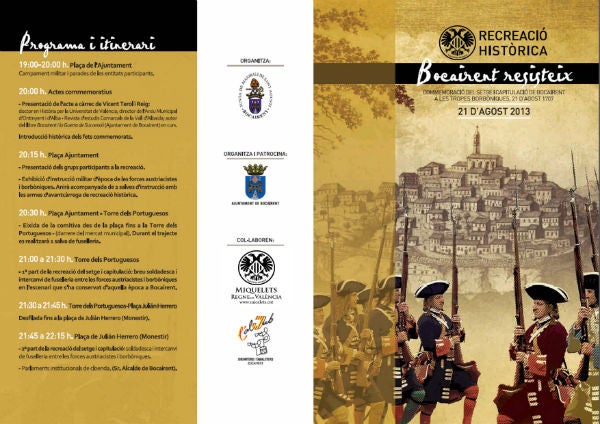 La festa començarà a les 19 hores a la plaça de l’Ajuntament on es muntarà el campament militar i les parades de les entitats participants. A les 20 hores tindrà lloc la presentació dels actes commemoratius a càrrec de Vicent Terol Reig, doctor en Història per la Universitat de València, director de l’Arxiu Municipal d’Ontinyent i d’Alba-Revista d’estudis comarcals de la Vall d’Albaida, a més d’autor del llibre Bocairent i la Guerra de Successió.