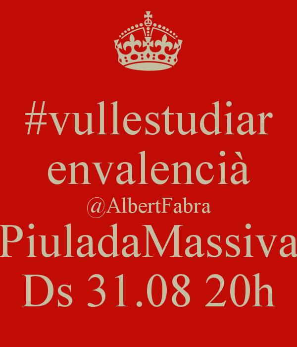 Davant el començament del curs escolar 2013-14 en què segons les estimacions d’Escola Valenciana 114.000 famílies valencianes no podran escolaritzar els xiquets en la línia en valencià per les traves que hi posa el govern del Partit Popular a la Generalitat Valenciana, “jo, Jaume Flor, anime els valencians a piular massivament el dissabte 31 d’agost a les 20.00 hores amb l’etiqueta #vullestudiarenvalencià i la menció al president de la Generalitat @AlbertoFabra en favor del dret dels valencians a estudiar en valencià, per si en voleu fer difusió”.
