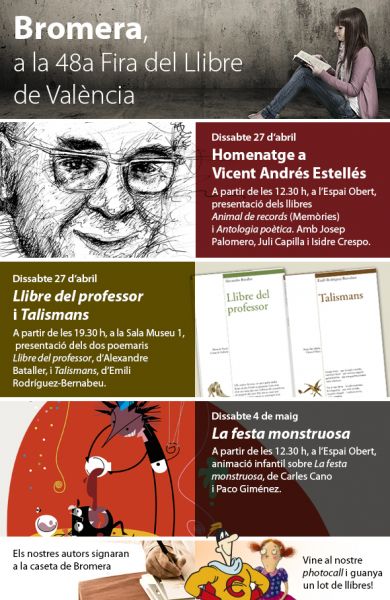 Entre les activitats que Bromera organitza aquest primer cap de setmana, destaca l’homenatge a Vicent Andrés Estellés, que tindrà lloc hui a les 12.30 hores. En aquest acte, presentat per Josep Palomero i amb la intervenció de Juli Capilla i Isidre Crespo, es presentarà la novetat Animal de records (Memòries), un recull de tres obres autobiogràfiques d’Estellés que mostren la part més humana del poeta, i es parlarà també de l’Antologia poètica que Bromera va publicar amb els versos més representatius d’aquest poeta emblemàtic.