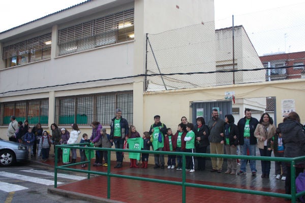 A les 8:45 hores, i encara que el temps no ha acompanyat, els pares, alumnes i professors s’han reunit a les portes del col·legi per a formar una cadena humana al voltant del Sant Joan de Ribera. Una cadena tenyida de verd, ja que tots ells portaven samarretes d’aquest color en les quals es podia llegir ‘Estimem l’escola pública’.