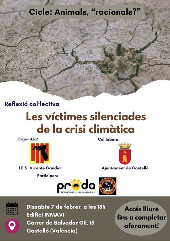 Així, una de les activitats destacades serà la xerrada “Les víctimes silenciades de la crisi climàtica”, inclosa dins del cicle “Animals, racionals?”, organitzat per l’IES Vicente Gandia, que tindrà lloc a l’INMAVI aquest dissabte, 7 de febrer, a les 18 hores, i comptarà amb la participació de membres de PRODA i Valencia Animal Save, que aportaran una mirada crítica i compromesa sobre l’impacte del canvi climàtic en els animals i els ecosistemes.