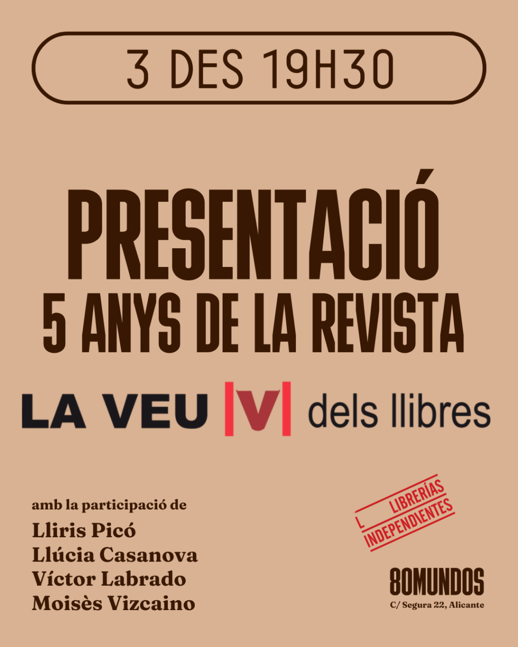 La Veu dels Llibres va complir cinc anys el 15 de febrer i, amb motiu d’aquest aniversari, enguany Diari La Veu del País Valencià ha organitzat una sèrie d’actes arreu dels territoris catalanoparlants per a donar a conéixer la revista d’informació i crítica literària, impulsada i coordinada per l’escriptor Víctor Labrado. Dimecres vinent, 3 de desembre, Alacant serà la ciutat que acollirà un col·loqui titulat en què intervindran l’escriptora i professora Lliris Picó; l’editora d’Andana Editorial i col·laboradora de La Veu dels Llibres, Llúcia Casanova; l’editor del Grup La Veu, Moisès Vizcaino, i Víctor Labrado. L’acte tindrà lloc a les 19.30 hores a la llibreria 80 Mundos, situada al carrer Segura, 22.