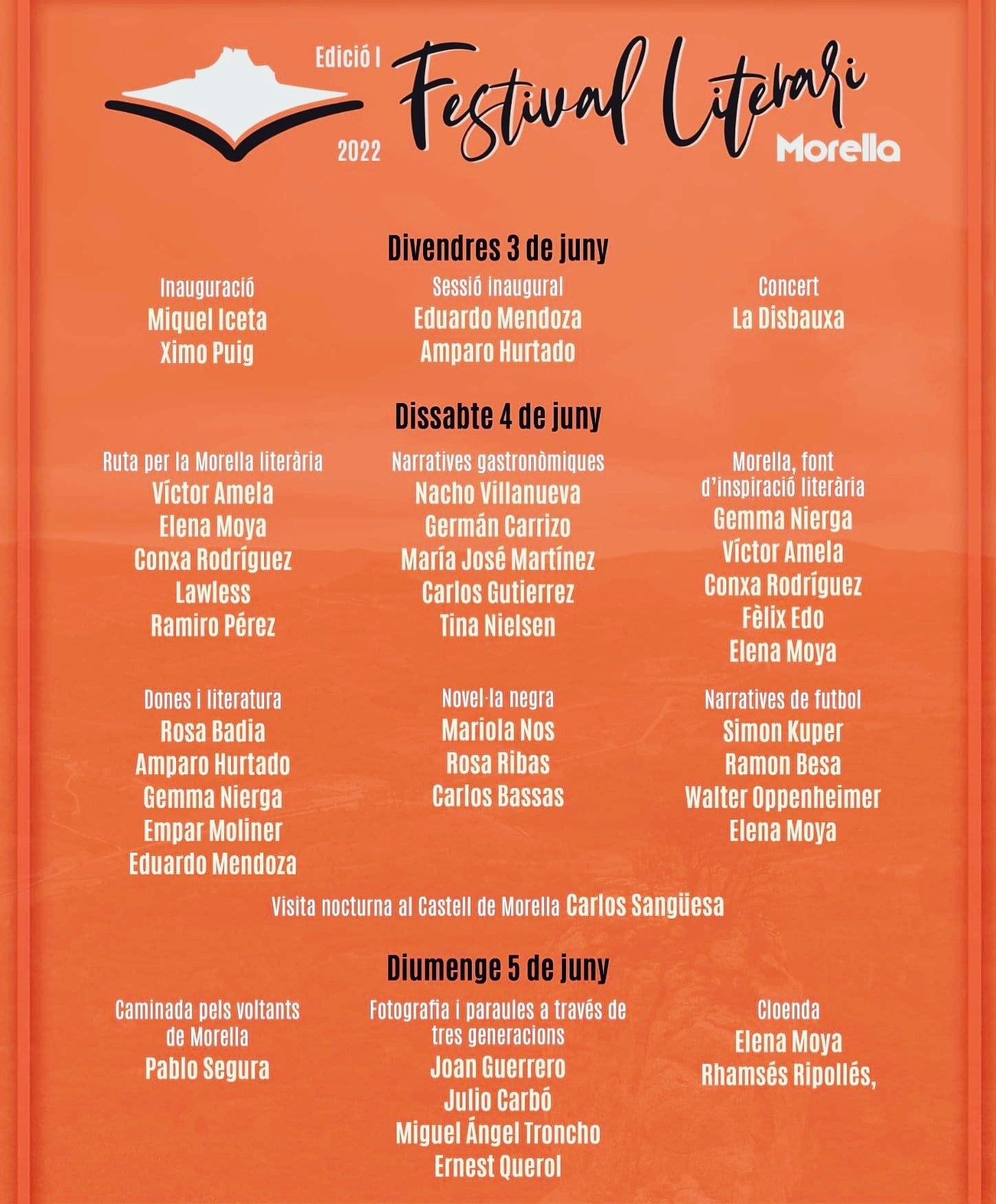 Així, hi haurà taules redones sobre diferents temàtiques: la mateixa ciutat com a font d’inspiració, la característica gastronomia d’una comarca que tradicionalment viu del camp, la popular novel·la negra després de sis edicions del certamen Morella Negra, el paper de la dona en la literatura, la narrativa futbolística i esportiva, i la fotografia com a mitjà per a contar històries.