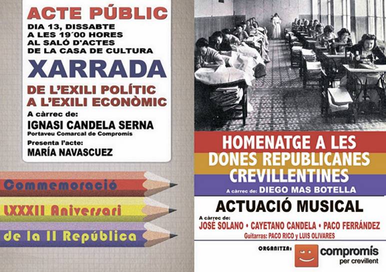En la celebració d’aquest acte per l’aniversari de la República, Compromís va voler abordar dos aspectes vigents en el context polític actual. Un és, “la recuperació de la memòria històrica”, i l’altre és la situació política i social actual que “requereix noves formes de fer política on les persones i el benestar social, la transparència i l’honestedat en la gestió publica siguen la prioritat”.