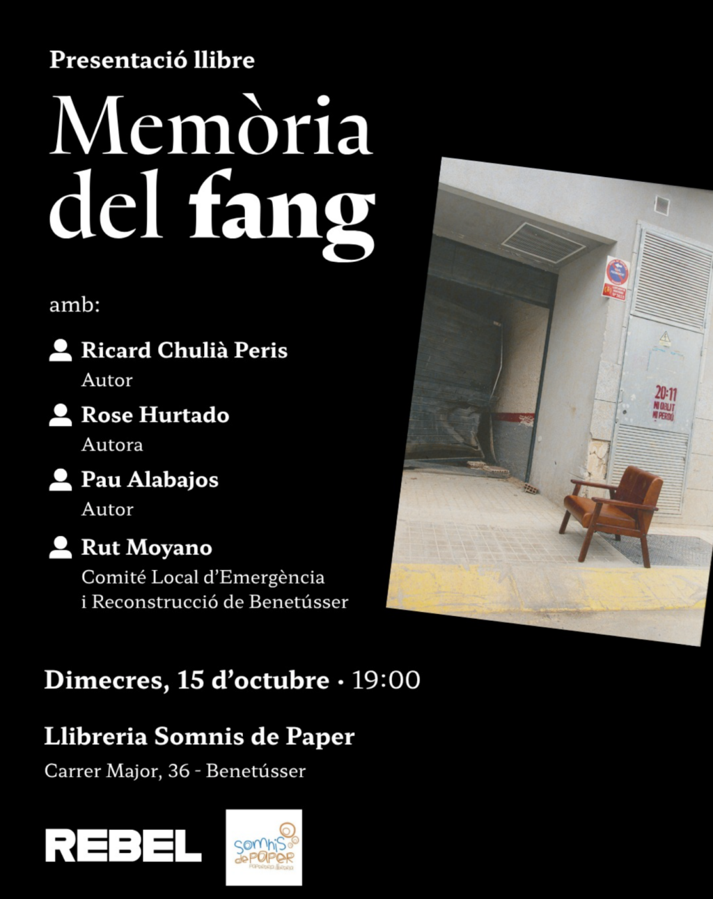 Aquest és un dels testimonis recollits al llibre Memòria del fang, de Rebel Edicions, amb textos de Pau Alabajos i Ricard Chulià, i fotografies de Rose Hurtado, que es presentarà el 15 d’octubre, a les 19 h, a la llibreria Somnis de Paper de Benetússer (l’Horta Sud). Hi participaran els autors i Rut Moyano, del Comitè Local d’Emergència i Reconstrucció.