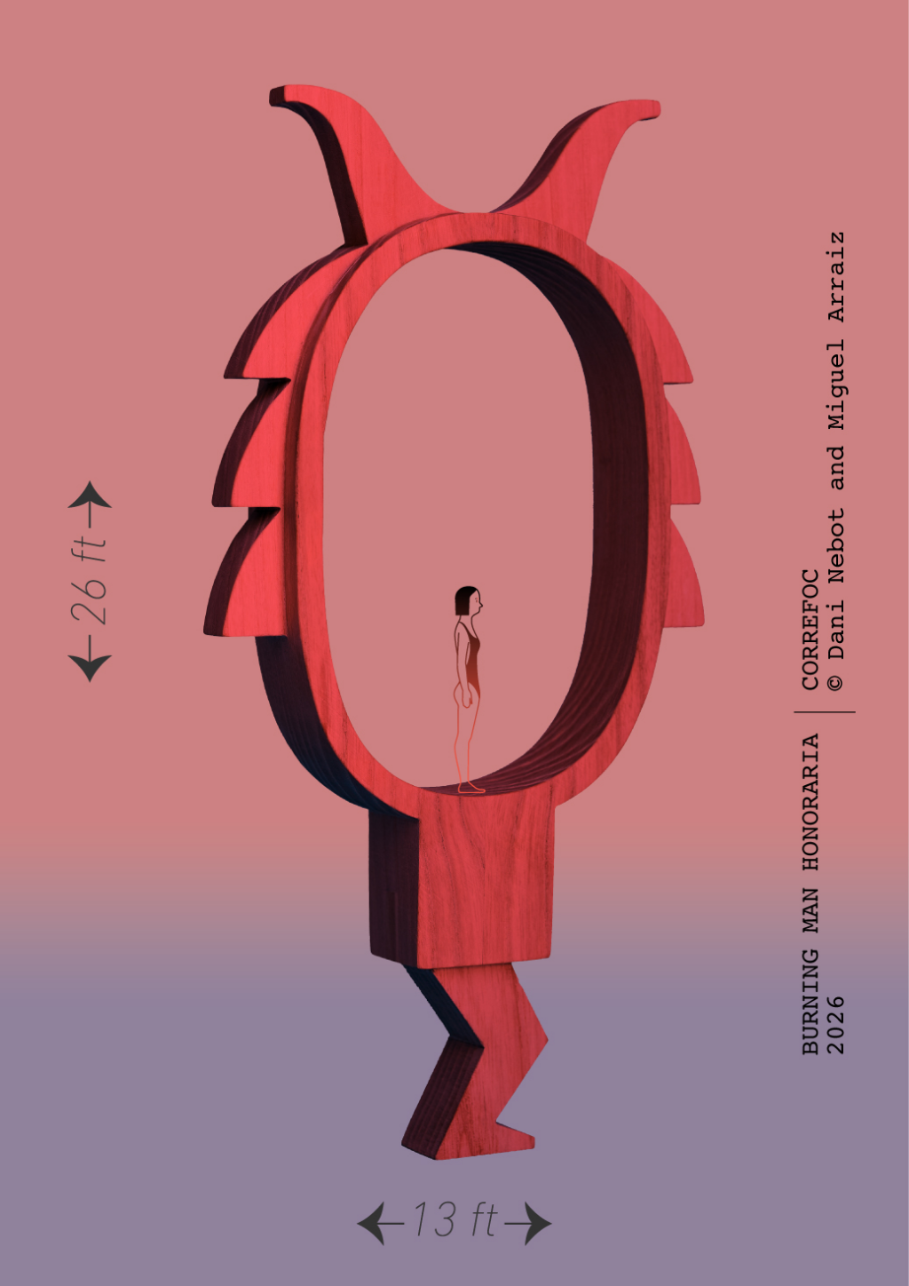 La peça es planteja com una figura vertical de gran escala, construïda en fusta i definida per una silueta humana. Durant el dia funcionarà com un element gràfic dins del paisatge del desert i, de nit, s’activarà mitjançant llum i foc. Al seu voltant es desenvoluparà una coreografia amb el Fire Conclave, amb la voluntat de generar un espai de trobada entre la tradició i la performance contemporània. La instal·lació està concebuda per culminar en la seua cremà, integrant el foc com a tancament ritual del procés.