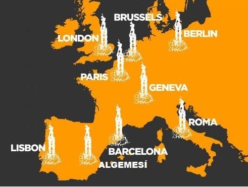 Brussel•les, París, Londres, Berlín, Ginebra, Roma, Lisboa, Barcelona i Algemesí són algunes de les prop de mig centenar de capitals i ciutats europees participants en aquesta iniciativa organitzada per Òmnium Cultural, amb el suport d’ACPV i Muixerangues del País Valencià.