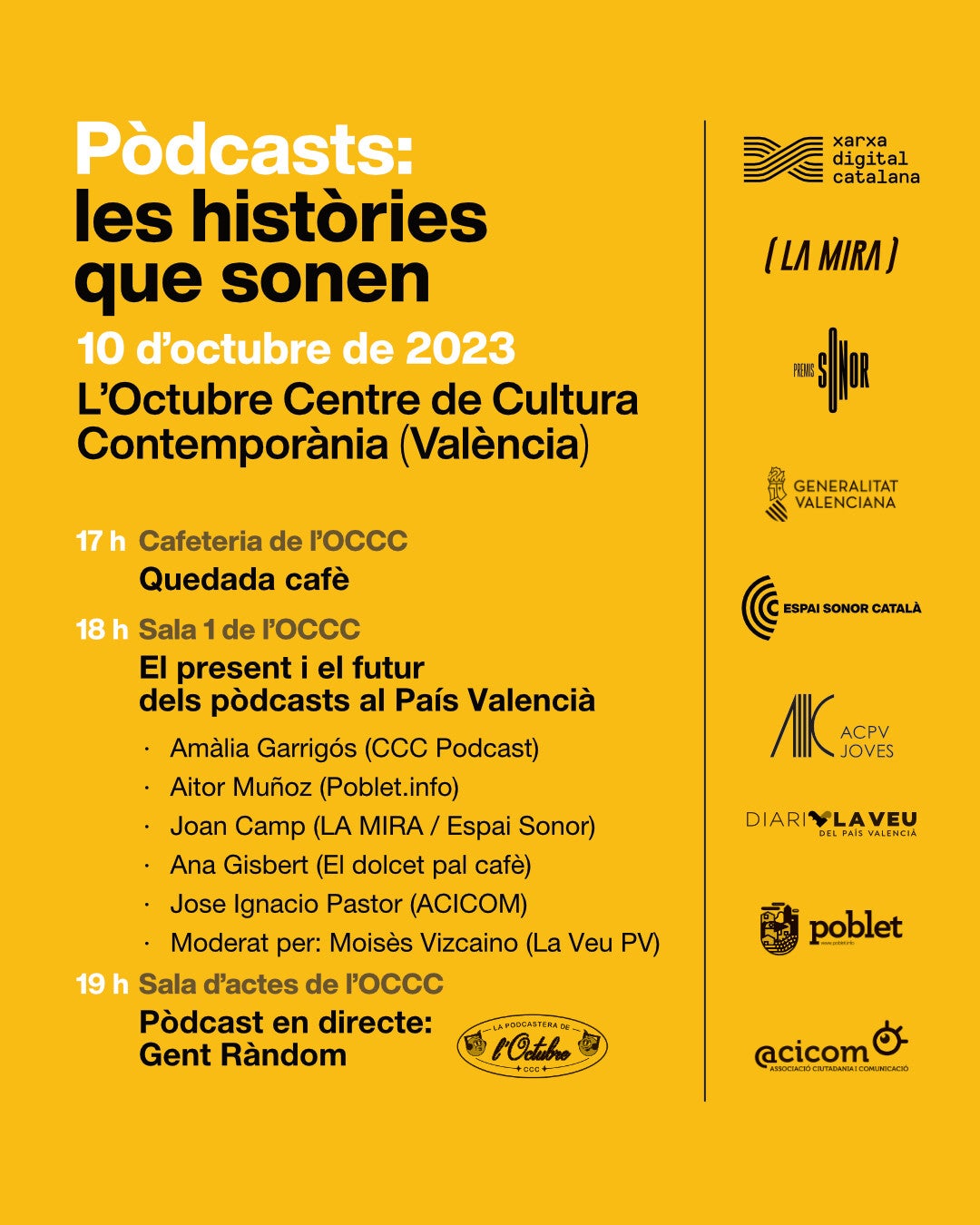 Aquesta jornada, que començarà a la cafeteria del centre esmentat des de les 17.00, comptarà amb la participació de diversos protagonistes del món del pòdcast: Amàlia Garrigós (CCCC Podcast), Aitor Muñoz (Poblet.info), Joan Camp (Espai Sonor), Ana Gisbert (del pòdcast «El dolcet pal cafè») i José Ignacio Pastor (ACICOM).