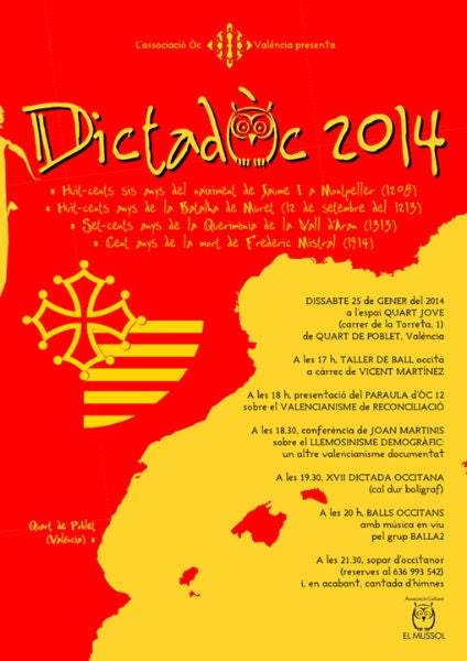 Dissabte se celebra la XVII edició de la Dictada Occitana a terres valencianes. L’Associació Cultural El Mussol Verd ha tingut “l’honor” enguany d’acollir-la al seu poble, Quart de Poblet, organitzant-la junt amb l‘Associació Òc Valéncia.