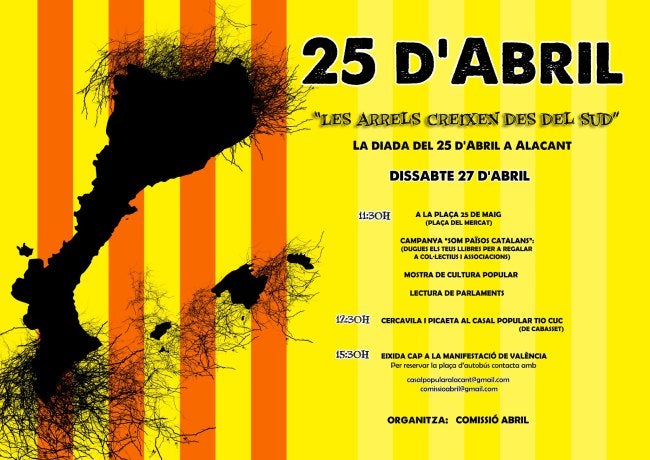 A continuació, aquelles persones que vulguen també acudir a la tradicional manifestació massiva pel 25 d’Abril de València, podran agafar l’autobús que organitza Acció Cultural del País Valencià, que es pot reservar a casaldalacant@acpv.cat.