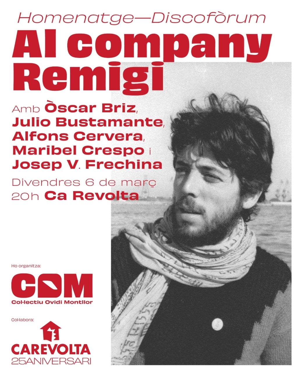 El pròxim divendres 6 de març a les 20 hores, Ca Revolta acollirà un homenatge–discofòrum dedicat a Remigi Palmero, una de les figures fonamentals del rock valencià. L’acte, organitzat pel Col·lectiu Ovidi Montllor (COM), reunirà músics, escriptors i periodistes per recordar la trajectòria i el llegat d’un creador clau per a entendre la història del pop fet des de València.