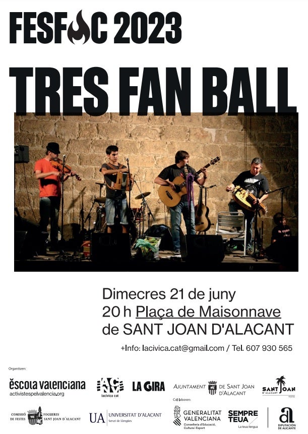 En primer lloc, divendres 21 de juny, a la plaça de Maisonnave de Sant Joan d’Alacant actuarà el grup de folk Tres Fan Ball a partir de les 20.00. L’Ajuntament de Sant Joan d’Alacant organitza aquest concert amb la col·laboració de la Diputació d’Alacant, de la Generalitat i d’Escola Valenciana.
