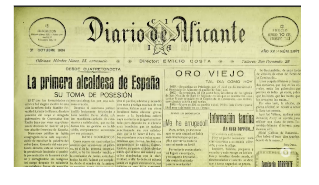 El 27 d’octubre del 1924 Matilde Pérez Mollà va ser designada alcaldessa de Quatretondeta (el Comtat), convertint-se en la primera dona de l’estat espanyol que assolia aquest càrrec municipal.