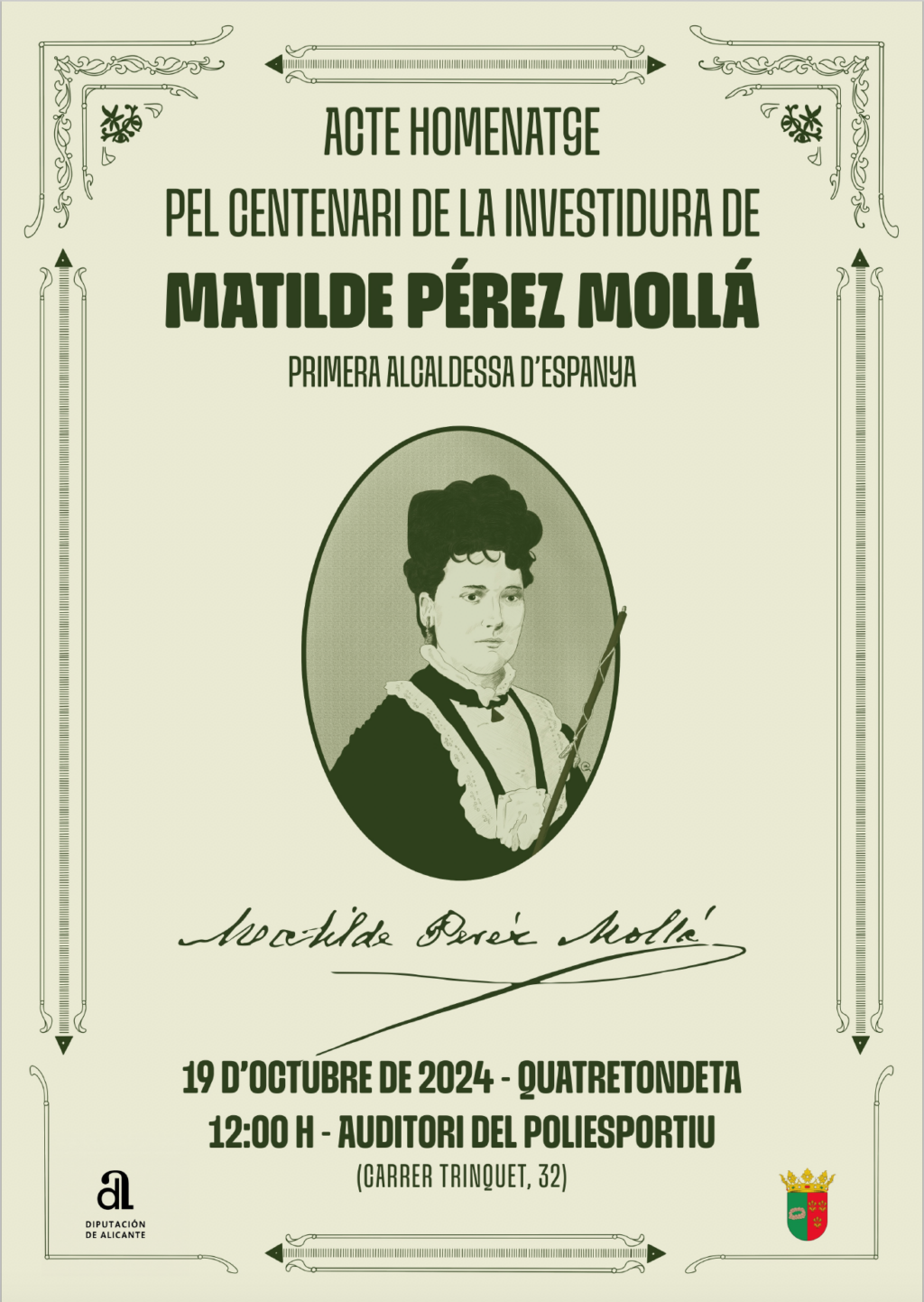 Fonts: Jordi Ortiz, «100 anys de la investidura de la primera alcaldessa a Espanya», Ajuntament de Quatretondeta, 2024 / Pilar Garcia, «La Mujer en la Administración Pública de Primo de Rivera (La primera alcaldesa: Matilde Pérez Mollá de Quatretondeta)», Cuadernos Constitucionales, 2023
