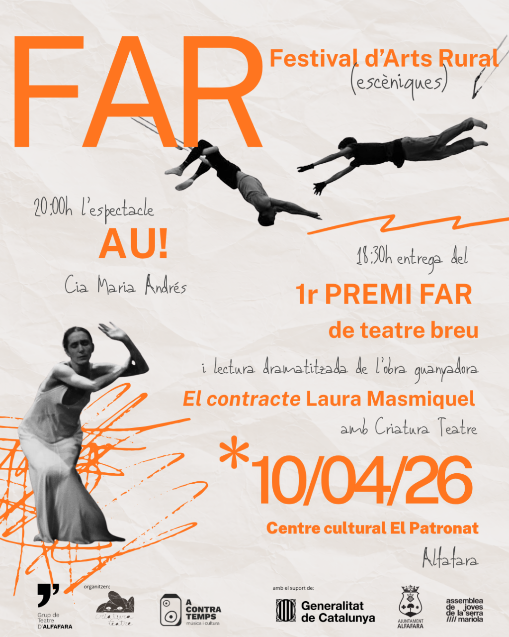 Alfafara (el Comtat) es convertirà aquesta Pasqua en un punt de trobada per al teatre contemporani en valencià amb la celebració de la primera edició del Festival d’Arts Rurals (FAR). Així, el Centre Cultural El Patronat acollirà el divendres 10 d’abril una jornada cultural que inclou el lliurament del Premi FAR de Teatre Breu, la lectura dramatitzada de l’obra guanyadora i l’espectacle AU!, de la Cia. Maria Andrés.