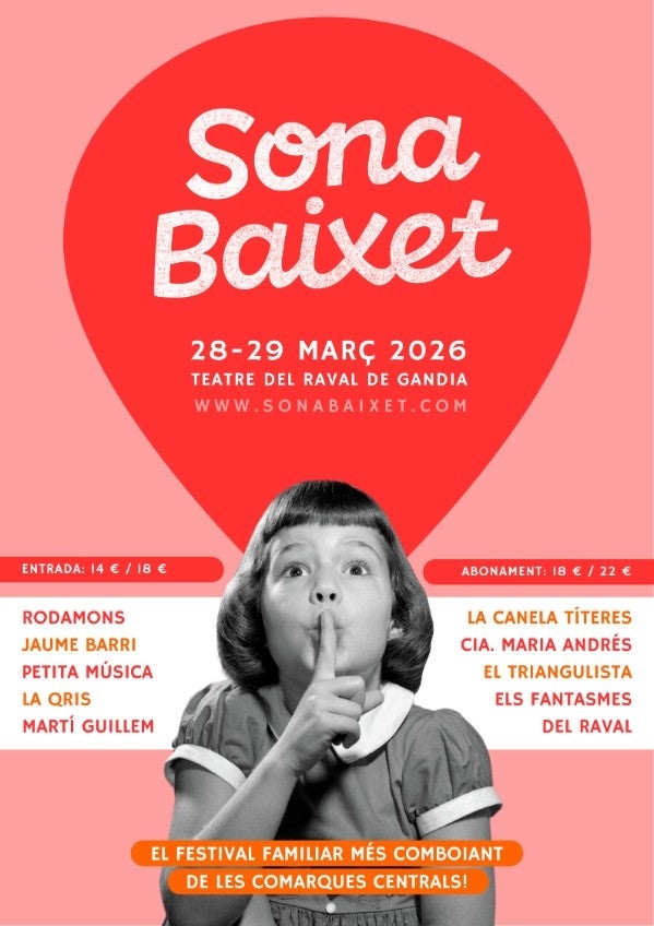 El Teatre del Raval de Gandia (la Safor) acull els dies 28 i 29 de març una nova edició del festival Sona Baixet, una cita consolidada com a referent cultural familiar a les comarques centrals. Amb una programació variada i pensada per a tots els públics, el certamen compleix 12 anys amb propostes que combinen música, teatre, clown, tallers i cinema, durant tot el cap de setmana.