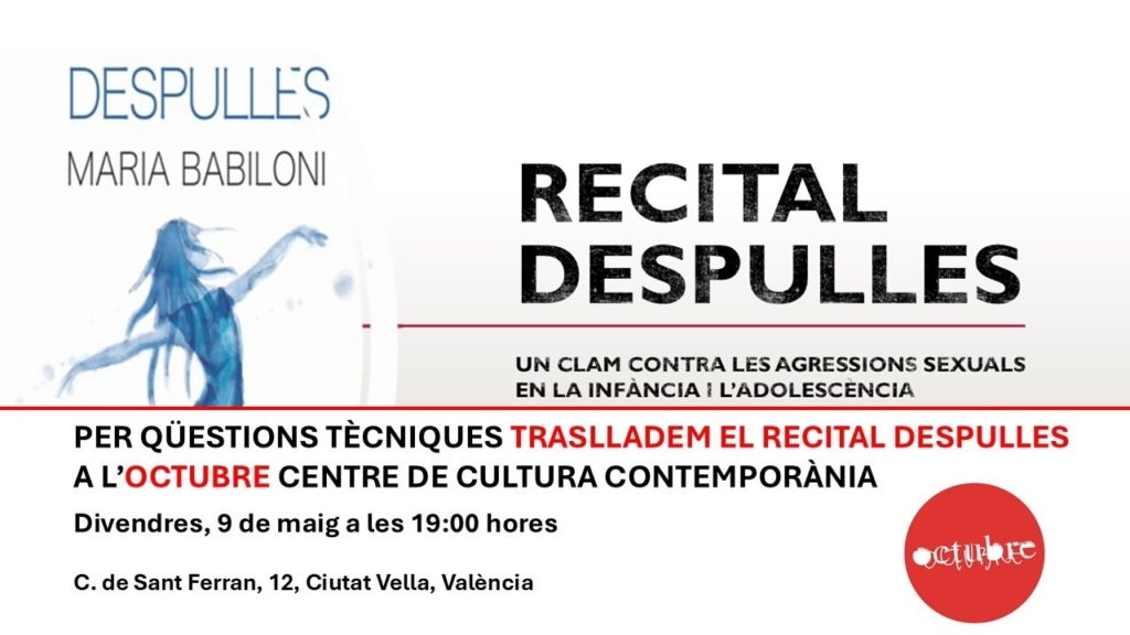 L’Octubre Centre de Cultura Conteporània, a València, acull el recital Despulles, un clam contra els abusos sexuals en la infància i l’adolescència, a partir de textos del llibre homònim, de Maria Babiloni (pseudònim de Pau Lluc), publicat per l’editorial Reclam. “Un de cada cinc infants pateix abusos sexuals. Un vaig ser jo. Despulles és un prou i un mai més”, afirma l’autora.