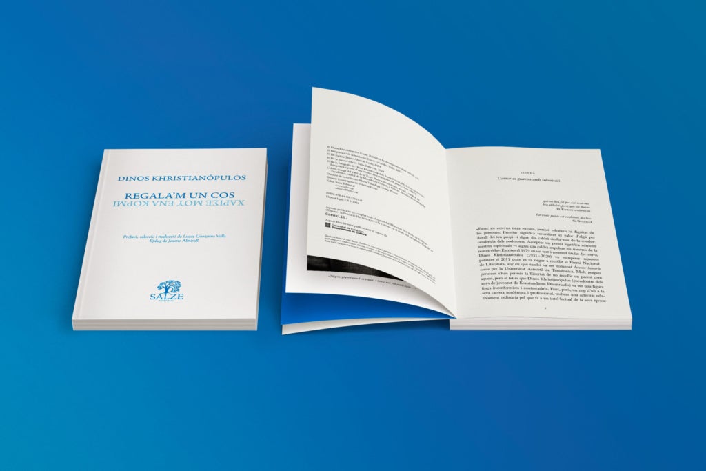 Salze Editorial publica en edició bilingüe l’antologia Regala’m un cos, del poeta grec Dinos Khristianópulos (Tessalònica, 1931-2020). Una tria de quasi noranta poemes a partir de l’obra completa, que aplega tots els motius de la seua poètica, duta a terme i traduïda per Lucas Gonzalvo Valls. El títol del volum pertany a un poema del seu recull Anhel indefens (1955-1970).