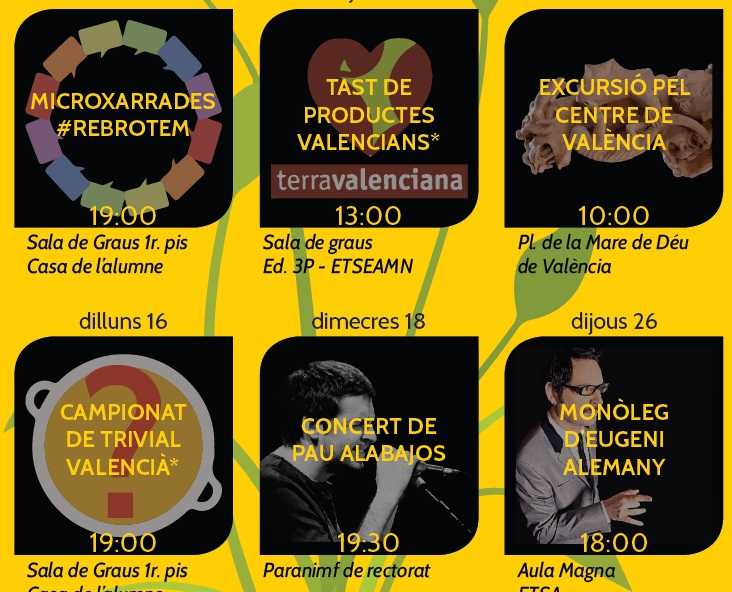 Aprofitant l’inici del segon quadrimestre, un període en què els estudiants de la Universitat Politècnica de València disposen de més temps lliure per assistir a activitats, el BEA (Bloc d’Estudants Agermanats) ha organitzat un ampli ventall d’activitats culturals que se celebraran al llarg de les pròximes quatre setmanes de febrer dins Rebrotem 2015.