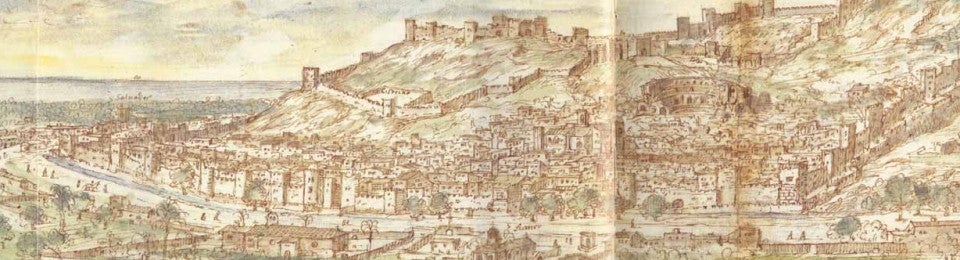 Es tracta d’una vista panoràmica de Morvedre en què podem distingir, sota les muralles del castell, el teatre romà. En aquest dibuix ja no hi apareix l’escena, un fet que, afegit a les anàlisis estratigràfiques, fa pensar que es va esfondrar durant la primera meitat del XVI, probablement pels combats de la revolta de les Germanies. Caldrà esperar el segle XVIII per trobar els primers plànols del monument, així com els primers estudis de l’estructura.