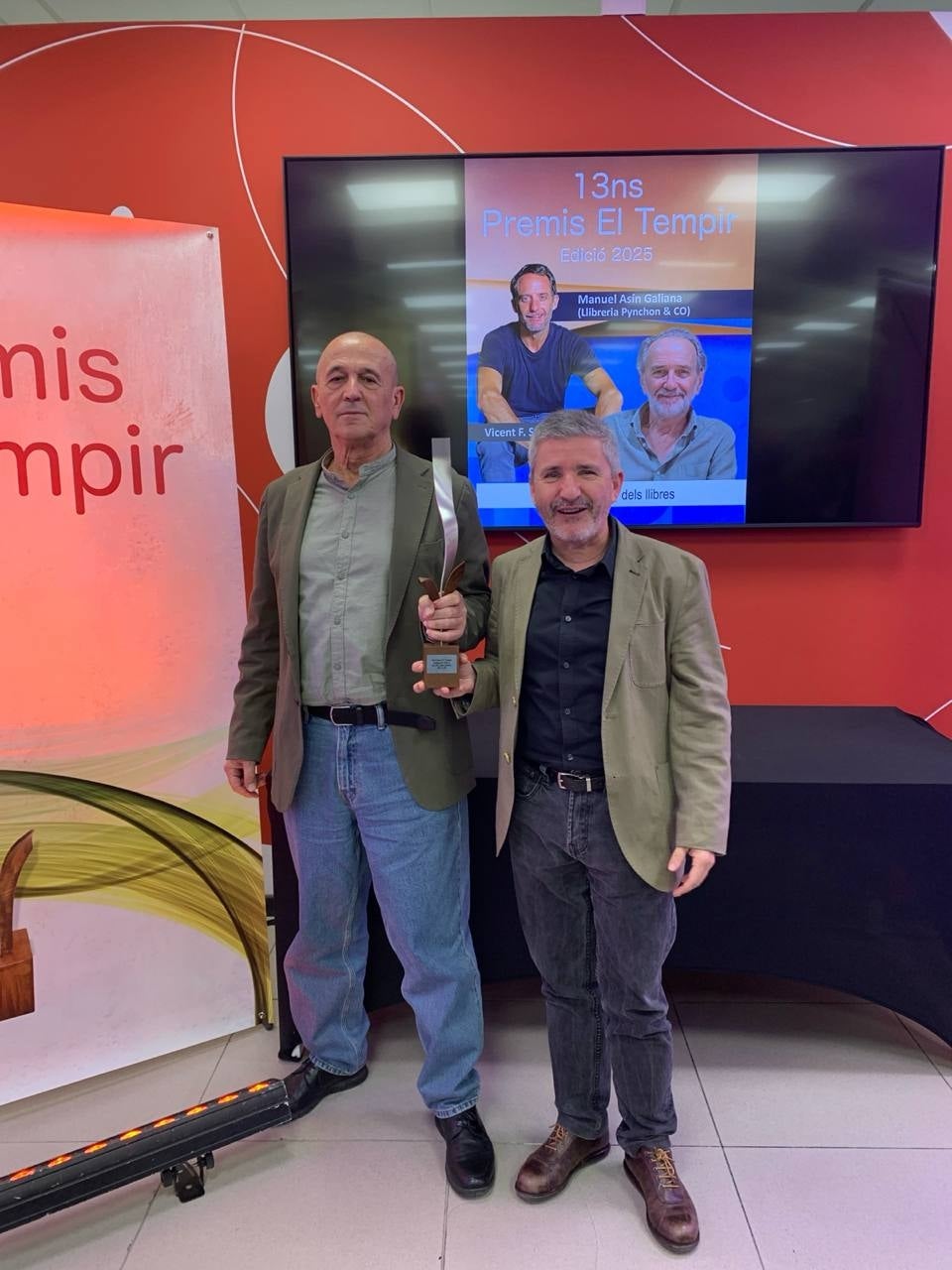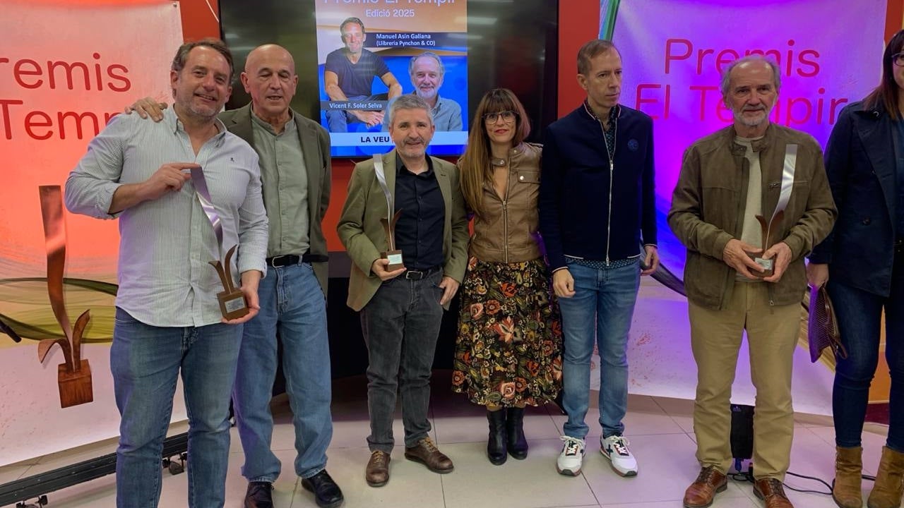 La segona meitat de la gala va posar el focus en la força de la societat civil amb tres guardons que van dibuixar un mapa d’arrelament i constància. El primer, per a Vicent F. Soler i Selva, pel treball tenaç en la divulgació de la història de l’educació pública a Elx (Baix Vinalopó) i en la recuperació de la memòria col·lectiva local. El segon, per a Manuel Asín Galiana, ànima de la llibreria Pynchon & Co d’Alacant (l’Alacantí), convertida en un espai de trobada, lectura i activisme cultural malgrat la intempèrie institucional. I el tercer, per a La Veu dels Llibres —amb Víctor Labrado com a ideòleg i Moisés Vizcaíno com a editor—, un projecte que ha articulat un ecosistema literari en català, connectant autors, editors i lectors de punta a punta del país.