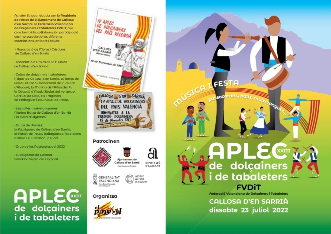 Callosa d’en Sarrià acull aquest dissabte el XXIII Aplec de la FVDiT, un esdeveniment que aplega cada any colles de dolçainers i tabaleters de tot el País Valencià. Està previst que acudisquen a l’acte una vintena de colles d’arreu de les comarques valencianes, a les quals se sumen dues colles muixerangueres i quatre grups de danses.