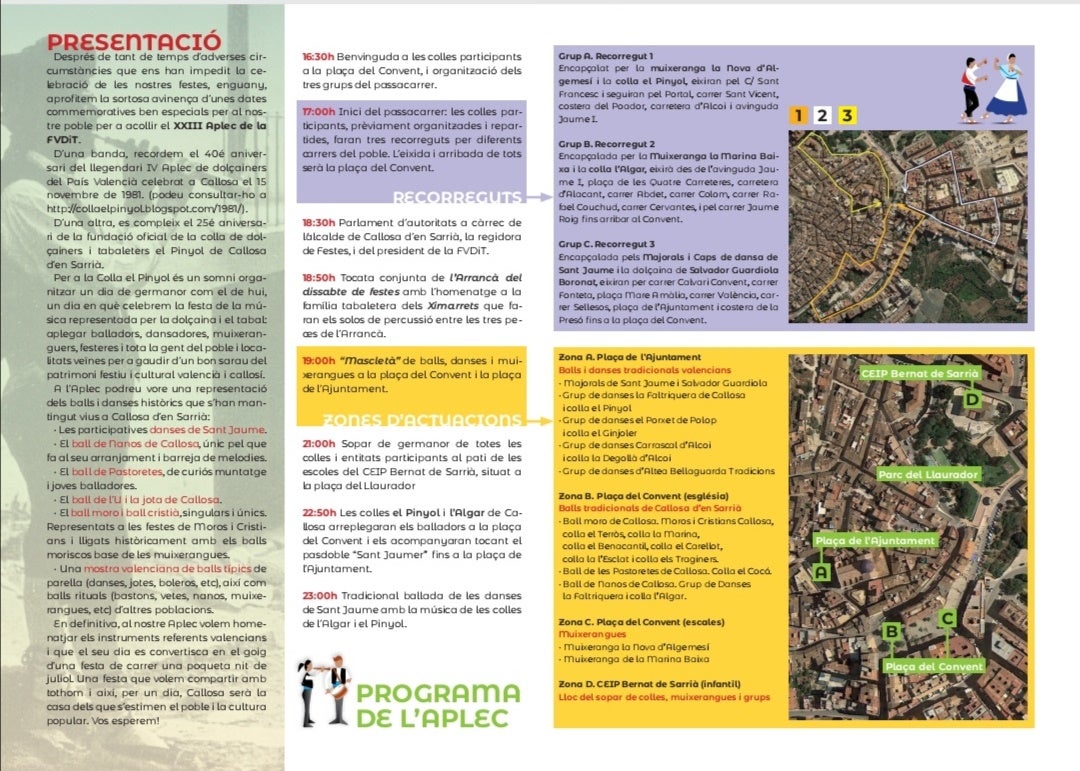 L’aplec s’emmarca dins de les festes de Sant Jaume, els tres dies de danses que Callosa celebra cada any. A més de les danses, aquestes festes mantenen tradicions on intervé el toc de la dolçaina i el tabal, amb peces pròpies que formen part d’un repertori únic, com «La correguda del gall» o «Les cucanyes». Poble de tradició dolçainera que s’ha transmés de generació en generació, homenatjarà també dissabte els Ximarrets, família tabaletera per excel·lència que interpretarà el toc de «L’arrancà de dissabte de festes». També compta amb un representant de la família dolçainera callosina, Salvador Guardiola Boronat.