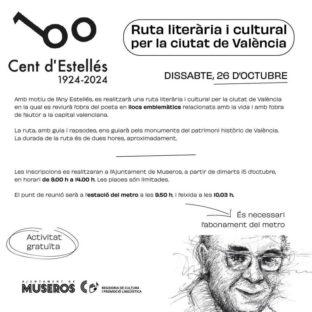 Una activitat similar es desenvoluparà des de Museros (Horta Nord) a través del seu ajuntament, que ha impulsat una ruta literària per València per tal de reviure l’obra d’Estellés visitant els llocs emblemàtics relacionats amb la vida i l’obra del poeta.