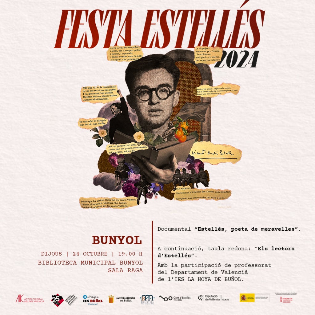 Una altra de les localitats que celebrarà homenatge a Estellés serà Bunyol, capital de la comarca castellanoparlant de la Foia de Bunyol, amb la projecció del documental «Estellés, poeta de meravelles» i amb una taula redona en la qual participarà el professorat del departament de valencià de l’IES La Hoya de Buñol, a la sala Raga de la biblioteca municipal a partir de les 19:00.