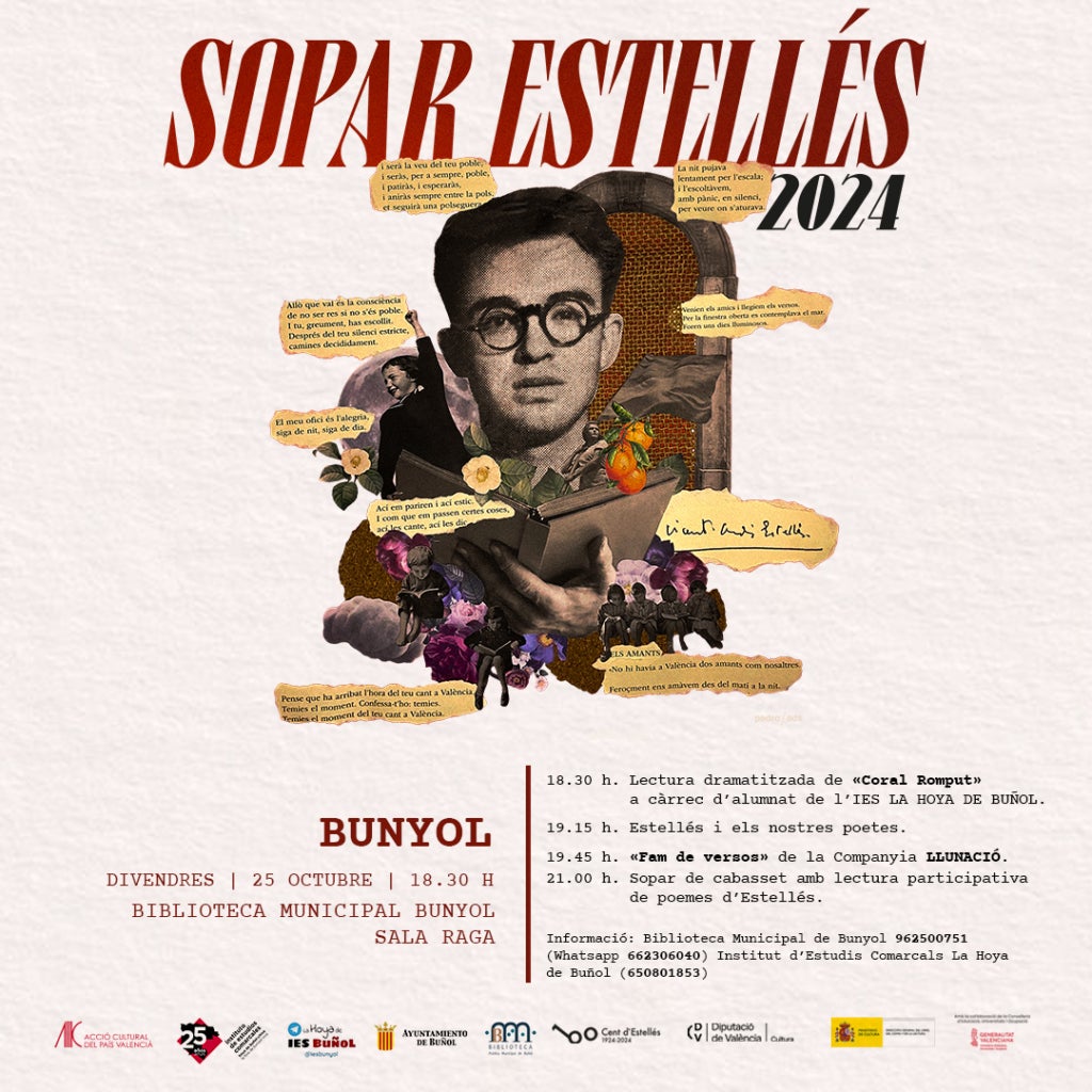 Bunyol continuarà a l’endemà amb els homenatges a Estellés a partir de les 18:30 hores a la mateixa ubicació, on es desenvoluparà una lectura dramatitzada de «Coral romput» a càrrec de l’alumnat de l’institut citat anteriorment. Tot seguit la companyia Llunació oferirà l’espectacle «Fam de versos» i finalment se celebrarà un sopar de cabasset amb lectura participativa de poemes.